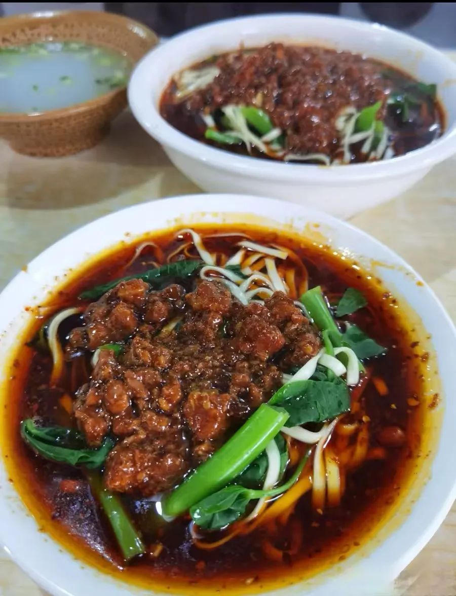 这时,我总会先从碗里挑出最大的那颗肉丁臊子,吹吹热气迫不及待放入口中。裹满浓郁酱汁的肉臊子,一入口瞬间化开,肉香四溢,直钻心底。再用筷子将面条与佐料在碗里使劲儿攉开,搅得面条根根都均匀地裹上酱料。随后,一口面一口菜一口酱接汤接连下肚。这还没完,再去灶台边咕嘟咕嘟一直熬着大肉骨头的锅里,自己用长柄勺子舀一碗称之为活汤的肉骨头汤,撒上几粒翠绿葱花,嘬上一口未放盐的活汤,那鲜美的滋味在口腔散开,缓和了赤浓酱汤面的浓郁,令人意犹未尽。我和发小扯着嗓子,高声喊道:“老板,我还有个二两,煮得了!” 待老板把那碗二两的面端来,再狼吞虎咽地吃完,这才感觉接上了饥肠辘辘的肠子。心满意足地打了个响亮的饱嗝,我和发小起身往学校跑去。跑到校门口时,上课铃声恰好响起,我俩这才发觉,吃得实在太撑了,两个小姑娘只能一手捧着被面条撑得鼓鼓的肚子,一手撑着墙壁,笑着喘着一步一步往楼上的教室挪去。
