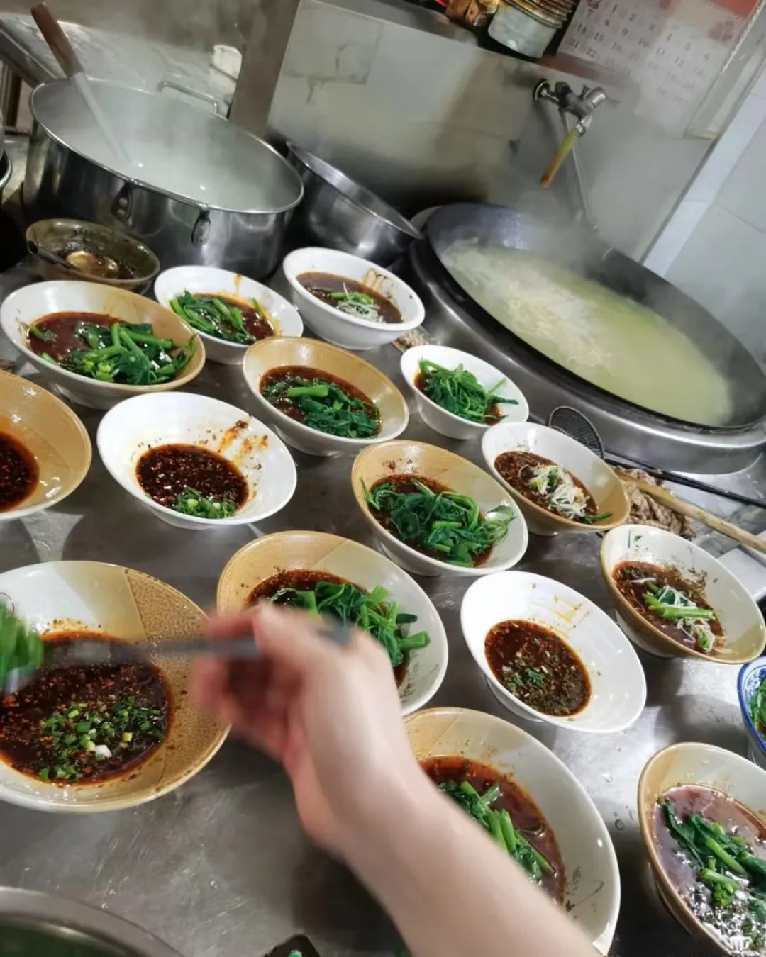 老板娘白嬢嬢总是利落而稳稳地掌管灶台专注煮面。那口直径八十公分的大铁锅一次便能煮上起码五斤面,煮的面是在大竹被大家亲切地唤作 “水面”的“韭菜叶子” 宽的面条,制面的店就在“满园春”斜对面和平街口子上。老板随时都可以跑几步从那儿捧回一大筲箕根根分明,透着新鲜劲儿的水面。