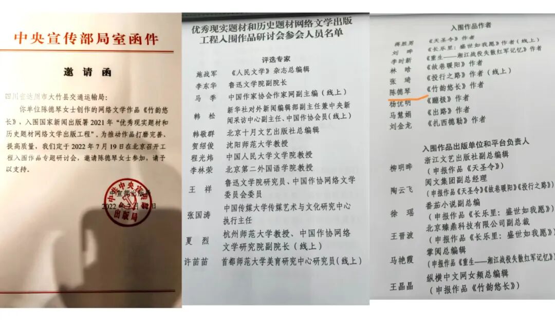 作者简介:陈德琴,女,四川大竹人,四川省散文学会会员、达州市作家协会会员、大竹县作家协会理事;作品散见《中国应急管理报》《团结报》《华西都市报》《西安晚报》《分忧》《龙门阵》《散文选刊·下半月》等报刊;短篇小说《雪山之恋》获2021年四川省第四届暨川渝首届农民工原创文艺作品大赛优秀奖,短篇小说《蒋局长的林场路》获四川省第五届农民工原创文艺作品大赛小说类二等奖,长篇散文《故乡的小河》获2019年达州市“抒写巴山”全国征文三等奖;著有长篇小说《稻浪滔滔》等四部,其中《竹韵悠长》签约纵横中文网并入选中国作协网络文学中心“喜迎二十大”优秀网络文学联展作品,入围中宣部新闻出版总署2021年度“优秀现实题材和历史题材网络文学出版工程”。